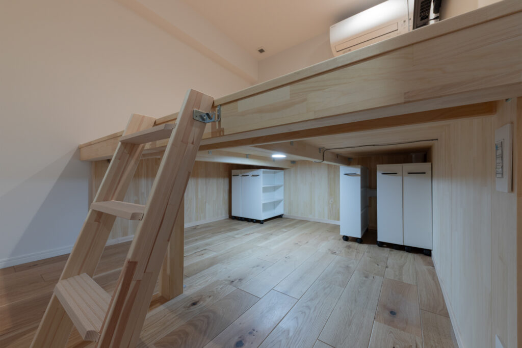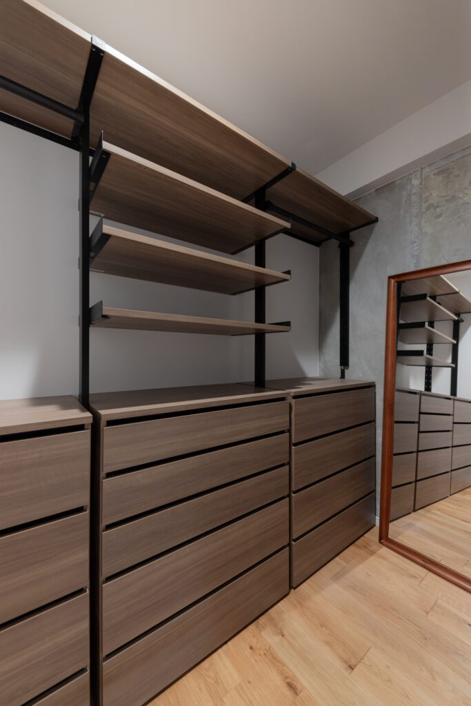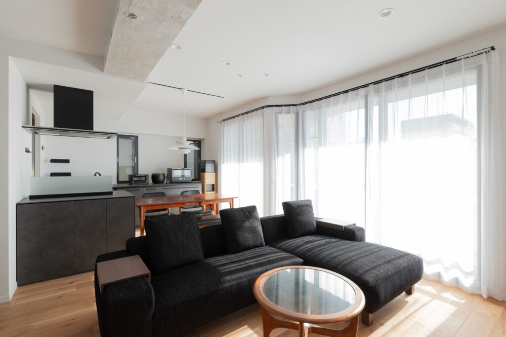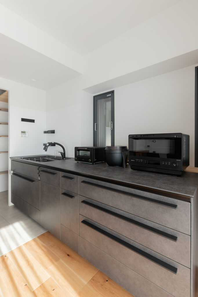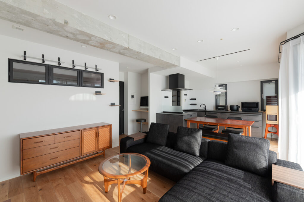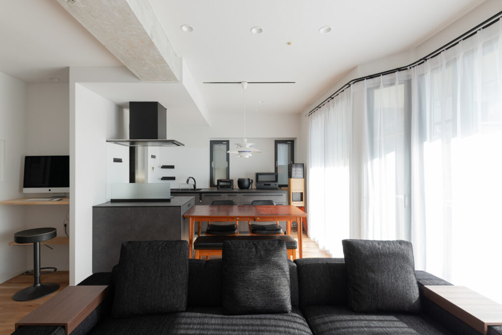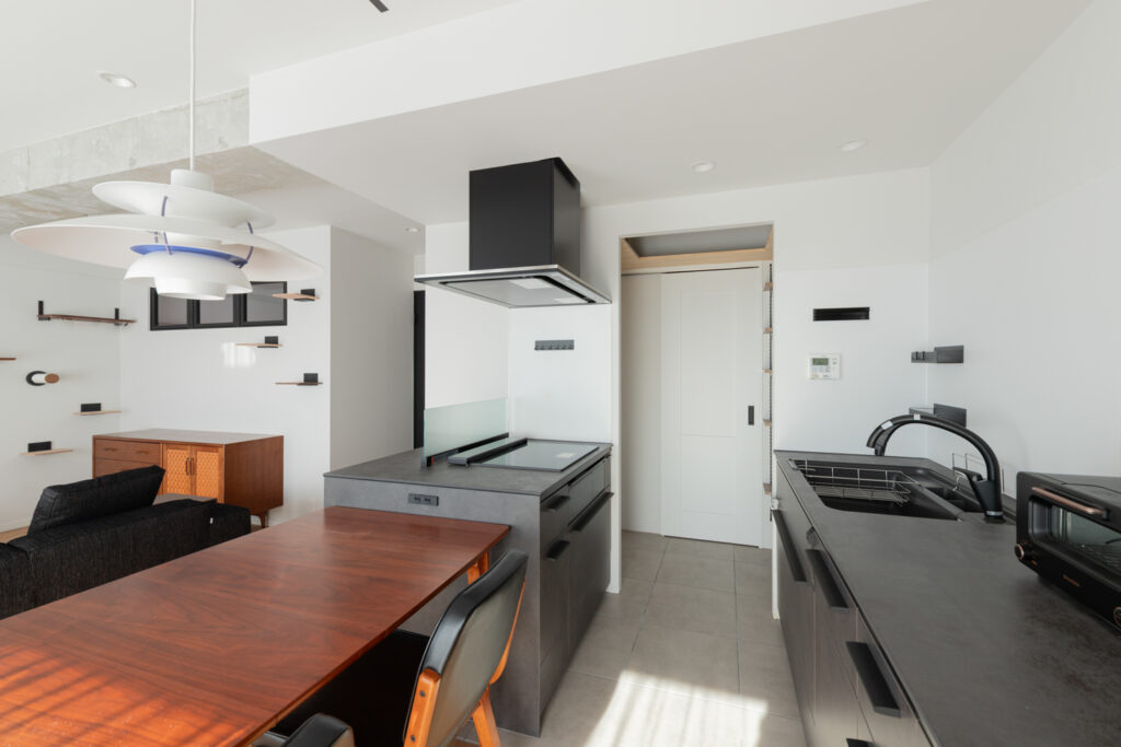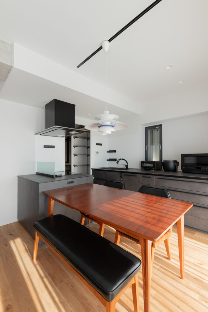キッチンは重厚感のあるダークトーンでまとめ、ダイニングテーブルを横並びに配置。配膳や片付けの動線をスムーズにしました。天井の梁をあえてコンクリート剥き出しにすることで、インダストリアルなアクセントを加え、都会的な空間を演出しています。
