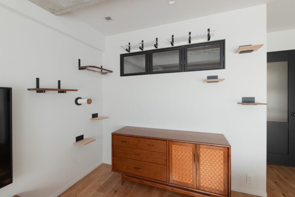 真っ白な壁面にリズムよく配置されたキャットウォーク。猫ちゃんが自由に高いところへ登れる機能性はもちろん、インテリアとしても美しいデザインに仕上げました。チェスト上の室内窓からは、光と風、そして猫ちゃんの気配が心地よく伝わります。