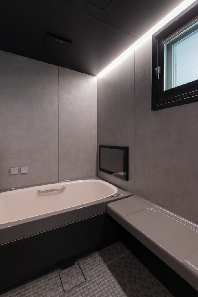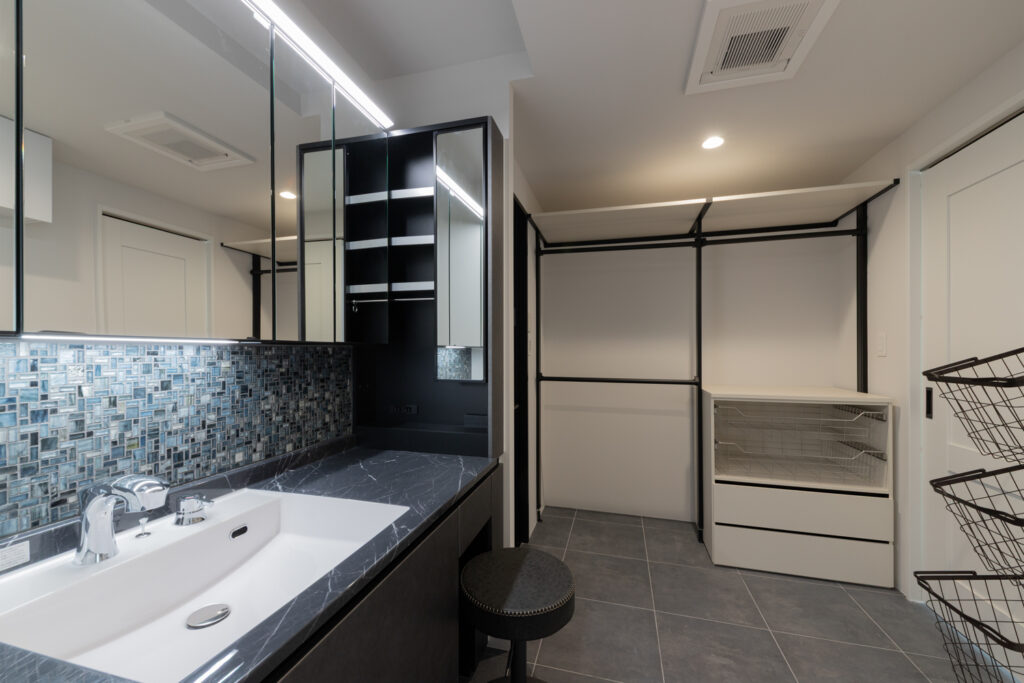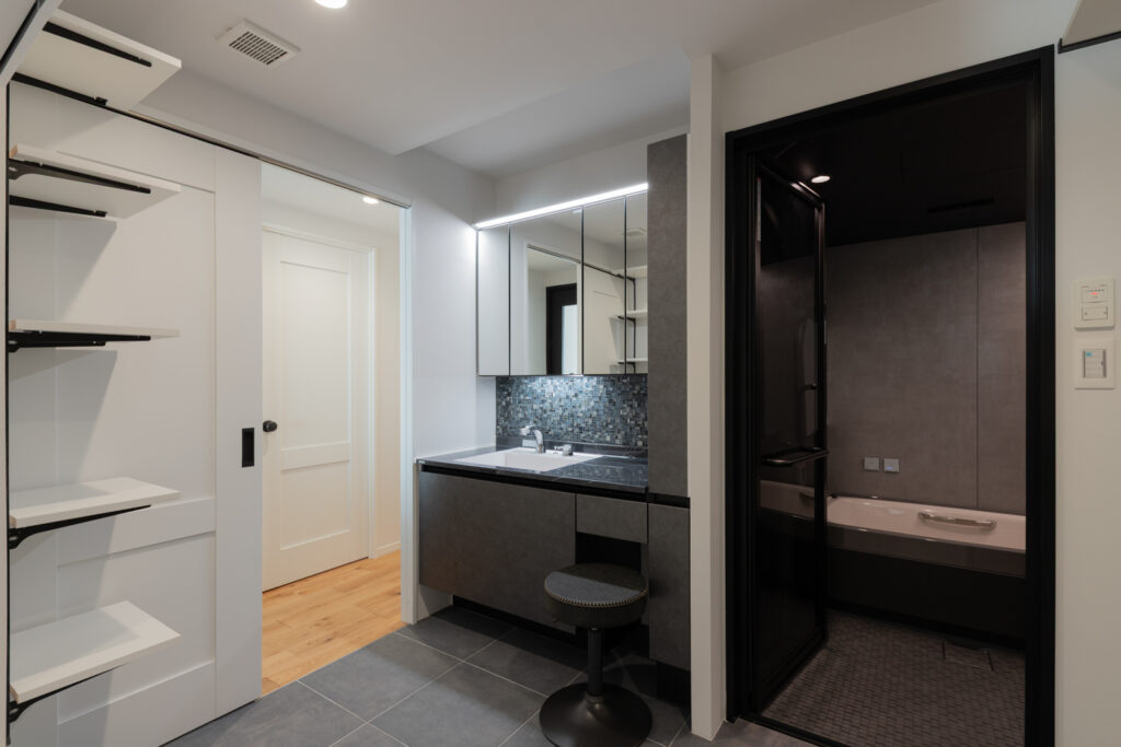 毎日使う場所だからこそ、非日常を感じられる上質な空間に。洗面台には高級感のある大理石調のカウンターと、表情豊かなタイルを組み合わせました。ブラックのフレームが印象的なガラス扉のバスルームは、視覚的な広がりと圧倒的な開放感をもたらします。